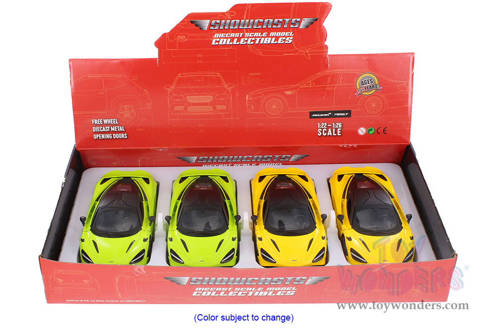 68276/2D Showcasts® Collectibles - McLaren 765LT. 1:24 scale diecast collectible model car. This McLaren is a 7.5"L x 3.25"W x 2"H die-cast metal car with freewheeling, turnable wheels, and openable doors. 4 pcs per display box in assorted colors.
