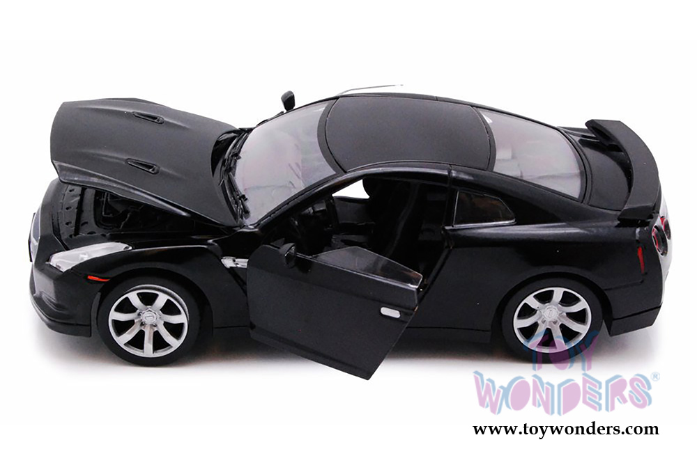 73384 Showcasts Collectibles - Nissan GTR Hard Top. 1:24 scale diecast collectible model car. This Nissan GTR measures 7.5"L x 3"W x 2.25"H diecast classic car with openable doors & hood. This Nissan GTR is manufactured by Motor Max Toys for Showcasts Collectibles. 73384 is in BLACK color. Individually packed in a window box WB. Box size: 9.75"Lx 4.25"Wx 4"H.