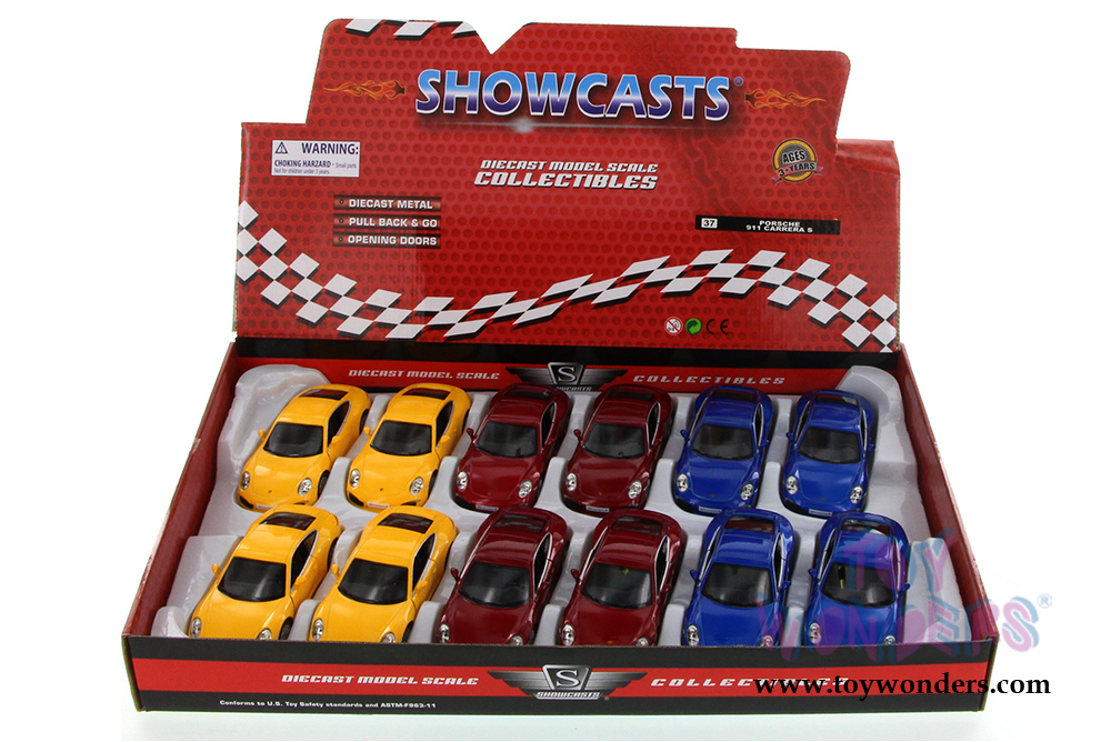 555010Z - Porsche 911 Carrera S Hard Top. 5" diecast collectible model car. The Porsche 911 Carrera S is a 5"Lx 2"Wx 1.25"H die cast metal car with openable doors and pull back action. This Porsche 911 Carrera S is manufactured by uni-Fortune for Showcasts Collectibles. 12 pcs per display box and in assorted colors. 48 pcs per inner box.