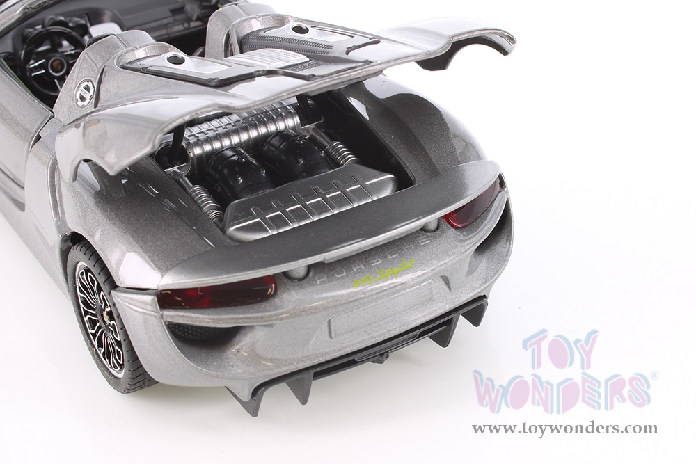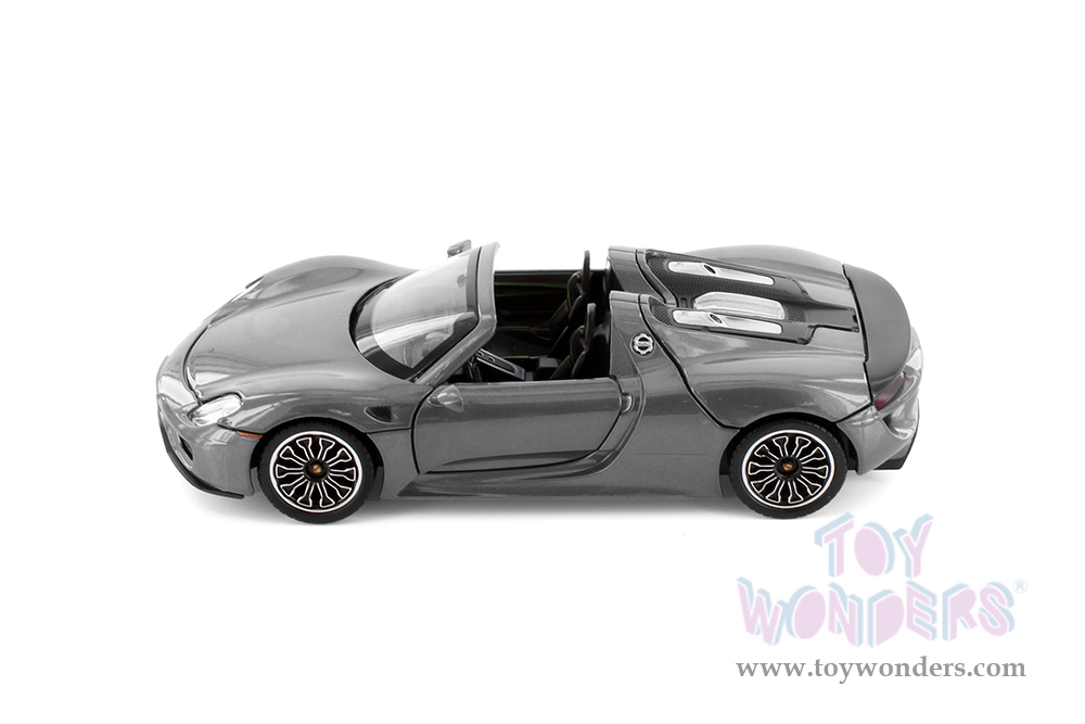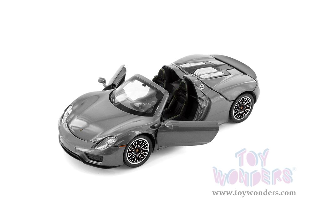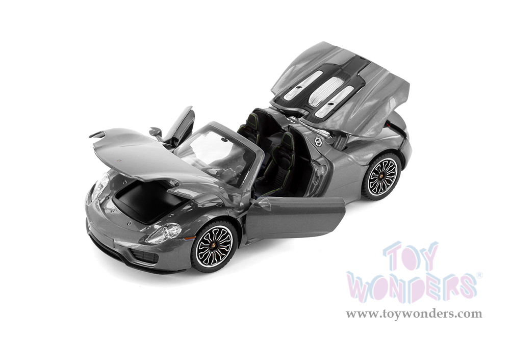 68243D Showcasts® Collectibles - Porsche 918 Spyder. 1:24 scale diecast collectible model car. These Porsches are 7.5"L x 3"W x 2"H die-cast metal cars with freewheeling, steering wheel. Openable doors, hood and engine compartment. 4 pcs per display box in assorted colors.