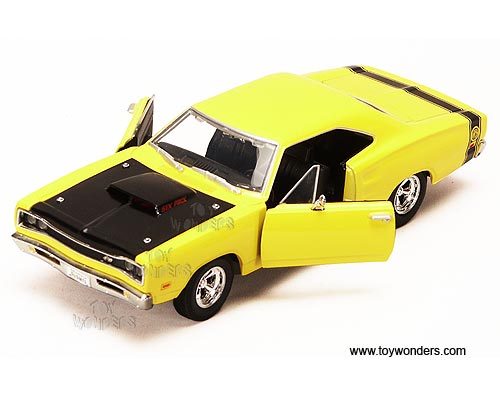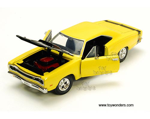 73315YL/6 Showcasts - 1969 Dodge Coronet Super Bee Hard Top. 1:24 scale diecast collectible model car. This Dodge SuperBee is an 8.75"Lx 3"Wx 2"H die cast metal plastic with openable hood & doors, free wheeling. The Dodge is manufactured by Motor Max Toys (Motormax). Each individually packed in a window box WB, and box size is 9.75"Lx 4.3"Wx 4"H. 73315 in YELLOW color with Black hood.