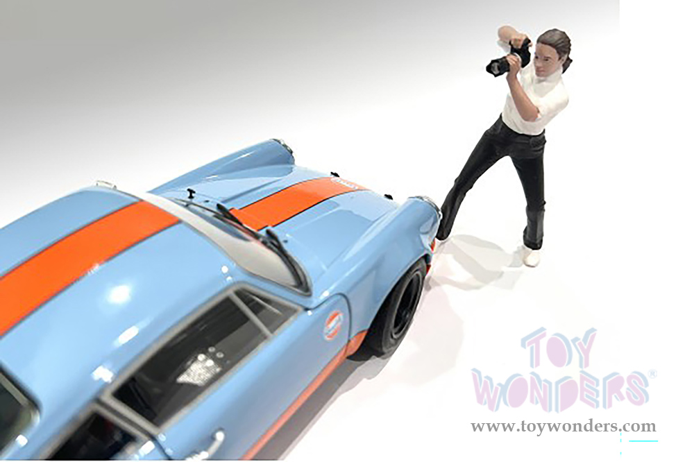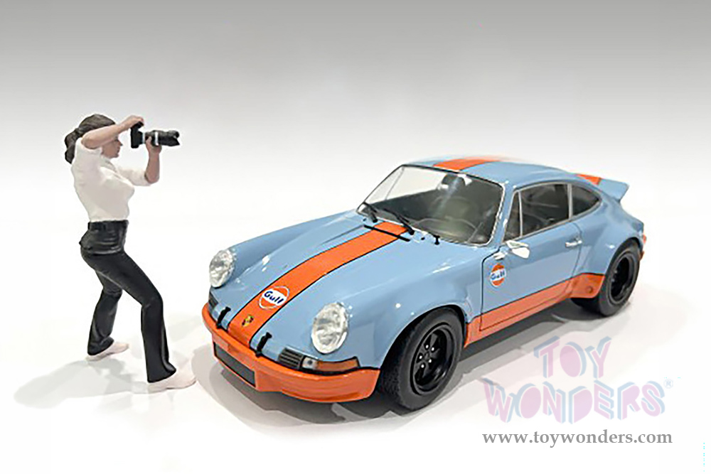 AD-25302 Showcasts® Figurines - "Photographers" Figure #2. 1:24 scale female in black pants and white turtle neck shirt. Hand painted poly-resin material. Only the figurine is included. This 2.75"H figure is great for decorating 1:24 scale cars and dioramas. Packed in a blister card. Card size: 4" x 7.5". 12 pcs. per inner. Note: Vehicle is not included.
