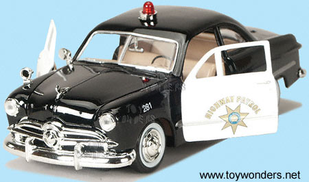 76410D 1949 Ford California Highway Patrol. 1:24 scale diecast model car. This 1949 Ford Cali highway patrol car is an 8" long diecast metal with opening doors, hood & truck and workable steering. This 49 Ford CA police emergency car is manufactured by Motormax for Showcasts Diecast Collectibles. 4 pcs per display box. 16 pcs per inner box. 76410 in BLACK color.