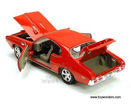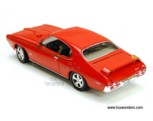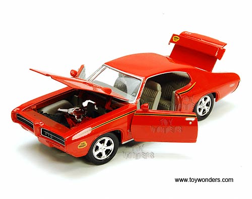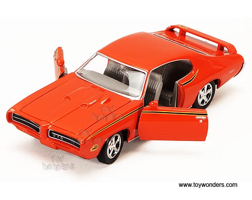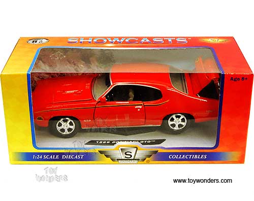 73242 Showcasts - 1969 Pontiac GTO Judge Hard Top. 1:24 scale diecast collectible model car. This Pontiac is an 8.5"Lx 3"Wx 2"H die cast metal car with free wheeling, steerable front wheels, and openable doors, hood & trunk. Individually packed in a window box WB. Box measures 9.75"Lx 4.5"Wx 4"H. The Pontiac GTO is manufactured by Motor Max Toys (Motormax). 73242 in ORANGE color.