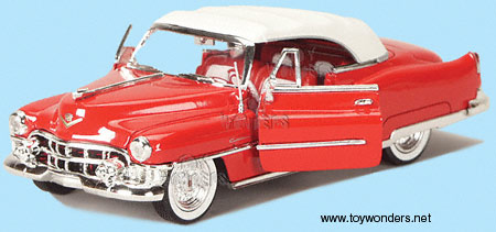50550 Cadillac Soft Top (1953) Scale: 1:24 Dimensions: 8.5"L x 3.25"W x 2.75"H 1953 Cadillac soft top die cast metal car with opening doors and hood, and free wheeling. Manufactured by Jada Toys 4 pcs per display box in asssorted colors 16 pcs per inner box