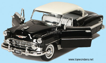 50230 Chevrolet Bel Air (1953) Scale: 1:24 Dimensions: 8.25"L x 3"W x 2.75"H 1953 Chevy Belair die cast metal car with opening doors and hood, and free wheeling. Manufactured by Jada Toys 4 pcs per display box and in assorted colors 20 pcs per inner box