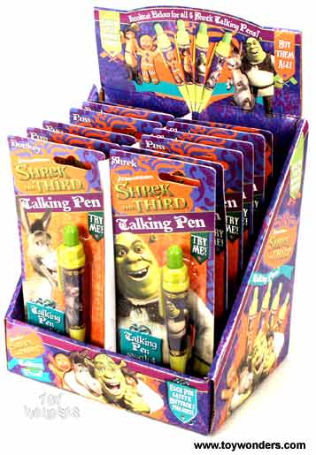 TW599-B Shrek The Third (III) Talking Pens. From the hit DreamWorks cartoon Shrek The Third. Just click the top of the pen to hear funny lines from the cartoon. Each pens says funny different lines; all from favorite episodes of the Shrek III. 4 assorted styles: Shrek, Puss, Gingy and Donkey. Each pen is individually blister carded in a TRY ME packages; can be pegged. 12 pcs per counter display box. Pen measure 5.5" in length. Sturdy plastic construction. Excellent quality batteries and speaker. Each pen is individually blistered: 3.5"Wx 8.25"H.