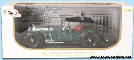 18118GN SIGNATURE MODELS 1934 Aston Martin MK II Scale: 1:18 Dimensions: 8"L x 3"W x 2.75"H 1934 Aston Martin die cast metal collectible car features opening doors/hood, removable top, and working steering. Display platform included. Manufactured by Signature Models Individually packaged in window box Color: Green This car was produced in two-seater and four-seater versions while the British company was under the direction of A.C. "Bert" Bertelli. It was in effect an improved version of the company's Le Mans model. Its new engine could produce 73 horsepower, the chassis was somewhat stiffer and the handling was much improved. The distinctive feature of the Mark II was the thermostatically controlled radiator shutter. The folded top was also moved outside the body to give more room for passengers in the four-seater model of which 45 were produced.