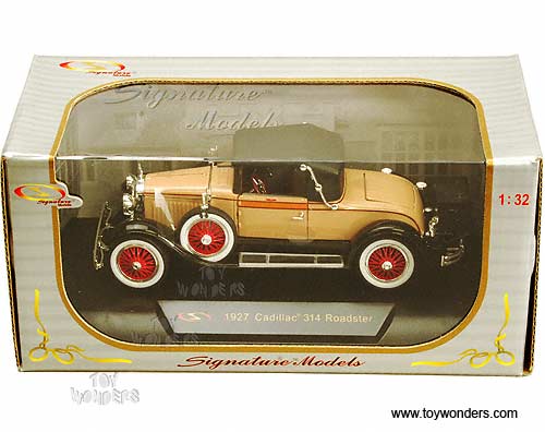 32352P Signature Models - 1927 Cadillac 314 Roadster. 1:32 scale diecast collectible model car. This Cadillac 314 Roadster is a 5.75"Lx 2"Wx 2"H diecast classic oldies with adjustable front wheels, openable hood, doors & trunk. Sits on a display plaque. This Cadillac 314 Roadster is manufactured by Signature Models. 32352 is in PEACH color. Individually packed in a window box. Box size: 8"L x 4.25"W x 3.75"H. GM is a trademark of the General Motors Corporation.