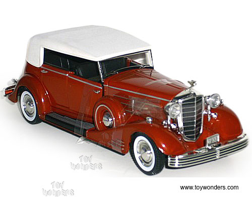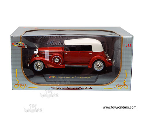 32302R SIGNATURE 1933 Cadillac Fleetwood. 1:32 scale diecast model car. Car is 6" long x 2.25"W x 1.75"H. Diecast classic oldies with adjustable front wheels, opening hood/doors. Sits on a display plaque. Signature Models. 32302 in RED w/White on top. Individually packed in a window box. Box size is 8"L x 4"W x 3.5"H.