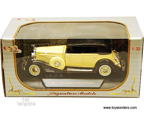 32367 SIGNATURE MODELS - 1933 Cadillac Fleetwood Phaeton. 1:32 scale diecast collectible model car. This 1933 Cadillac Fleetwood Phaeton is a 6.25"Lx 2"Wx 2"H diecast classic oldies with adjustable front wheels and openable hood & doors. Sits on a display plaque. This 33 Caddy Fleetwood Phaeton is manufactured by Signature Models. 32367 is in YELLOW color. Individually packed in a window box. Box size: 8"Lx 4"Wx 3.5"H. GM is a trademark of the General Motors Corporation.