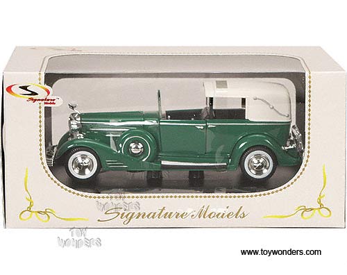 32327GN SIGNATURE - 1933 Cadillac Town Car. 1:32 scale diecast model car. 6" long diecast classic oldies with adjustable front, openable hood & doors. Sits on a display plaque. Signature Models. 32327 in GREEN color with white top. Individually packed in a window box. GM is a trademark of the General Motors Corporation.