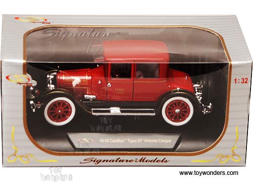32368R SIGNATURE MODELS - 1918 Cadillac Type 57 Victoria Coupe.1:32 scale diecast collectible model truck. 5.75" Cadillac Type 57 Victoria Coupe sits on a display platform. Individually packed in a window box. 32368 in RED color. GM is a trademark of the General Motors Corporation.