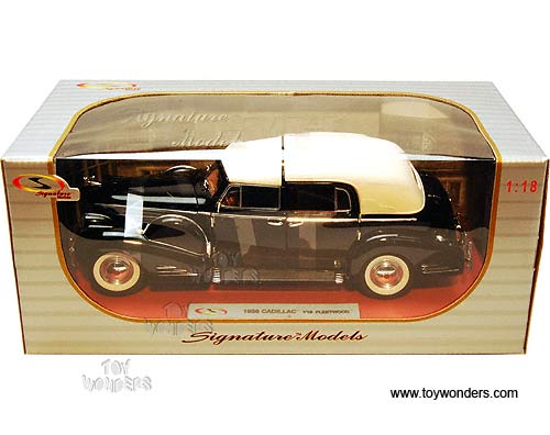 18117BK Signature Models - 1938 Cadillac V16 Fleetwood. 1:18 scale diecast collectible model car. This Cadillac V-16 Fleetwood is an 11'Lx 4"Wx 3.5"H die cast metal oldies car with openable doors, hood & trunk. Sits on a display platform. Limited edition 1 of 600. This 38 Cadillac is manufactured by Signature Models. GM is a trademark of the General Motors Corporation. 18117 in BLACK color with White top. Individually packed in a window box. Box size: 14"Lx 7"Wx 6"H.   To see more Cadillac die-cast collector models (click here).   Case pack: 6 pcs.Price quoted is for 1 pcs.