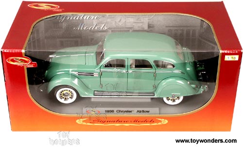 18126GN SIGNATURE MODELS - 1936 Chrysler Airflow. 1:18 scale diecast collectible model car. This Chrysler Airflow is an 11'Lx 3.75"Wx 3.5"H die cast metal oldies car with openable doors, hood & trunk. Sits on a display platform. Limited edition 1 of 600. This 1936 Chrysler Air Flow is manufactured by Signature Models. 18126 in GREEN. Individually packed in a window box. Box size: 14"Lx 7"Wx 6"H.