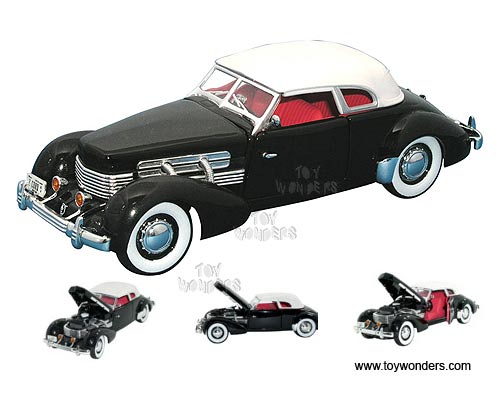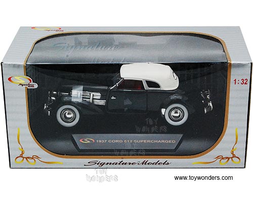 32312BK SIGNATURE MODELS - 1937 Cord 812 Supercharged. 1:32 scale diecast collectible model car. This 1937 Cord 812 Supercharged is a 6"Lx 2.25"Wx 1.75"H diecast classic oldies with adjustable front wheels and openable hood & doors. Sits on a display plaque. This 37 Cord 812 Supercharged is manufactured by Signature Models; ref. no. 32312 in BLACK color. Individually packed in a window box.