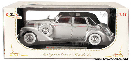 18127SV SIGNATURE MODELS - 1937 Lincoln Touring Cabriolet. 1:18 scale diecast collectible model car. This 1937 Lincoln Touring Cabriolet is an 11.75"L x 3.25"W x 3.75"H diecast metal classic oldies with highly detailed engine & interior and openable doors, hood & trunk. Sits on a display platform. This 37 Lincoln is manufactured by Signature Models. 18127 in SILVER color. Individually packed in a window box.