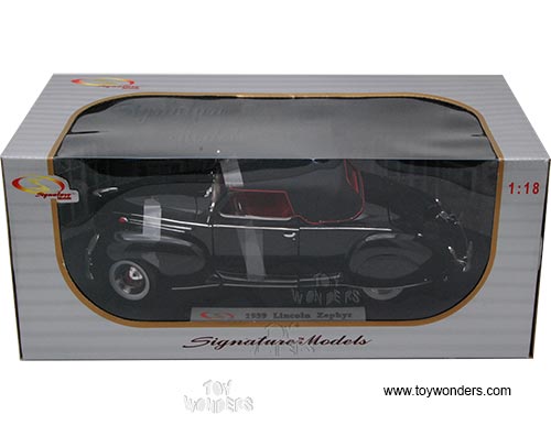 18102BK Signature Models 1939 Lincoln Zephyr 1/18 Scale.1939 Lincoln Zephyr diecast metal classic car with freewheeling action, steerable front wheels, highly detailed engine and interior, and opening doors, hood, and trunk. Display plaque included. Manufactured by Signature Models. Individually packaged in a window box. Window Box size: 14"W x 6"H x 7"D. 18102BK is BLACK color.