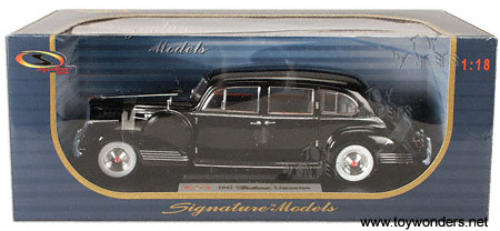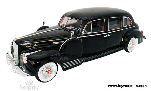 18128BK SIGNATURE MODELS 1941 Packard Limousine. 1:18 scale diecast collectible model car. This 1941 Packard Limo is a 12'Lx 3.25"Wx 4"H diecast classic with highly detailed engine, interior, openable doors, hood, and trunk. Sits on a display platform. This 41 Packard Limo is manufactured by Signature Models. 18128 in BLACK color. Individually packed in a window box.