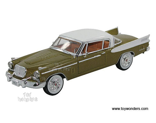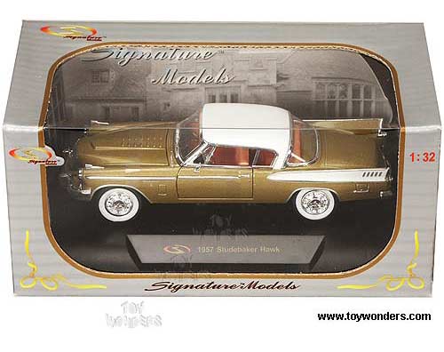 32399G SIGNATURE MODELS - 1957 Studebaker Hawk Hardtop. 1:32 scale diecast collectible model car. This 1957 Studebaker Hawk is a 6.5"L x 2"W x 1.5"H diecast classic car with openable hood and doors. Sits on a display plaque. This 1957 Studebaker Hawk is manufactured by Signature Models; ref. no. 32399G in GOLD color with White top. Individually packed in a window box. Window Box size: 8"L x 4.25"W x 3.75"H.