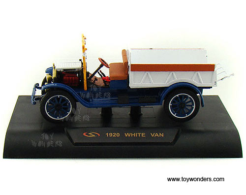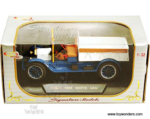 32393 Signature Models - 1920 White Van Pickup Truck. 1:32 scale diecast collectible model car. This White Van pick-up is a 6"L x 2"W x 2.25"H diecast metal with openable hood and tailgate. Sits on a display plaque. 32393 is in BLUE and WHITE two-tone colors. Individually packed in a window box. Window Box size: 8"L x 4"W x 3.75"H.