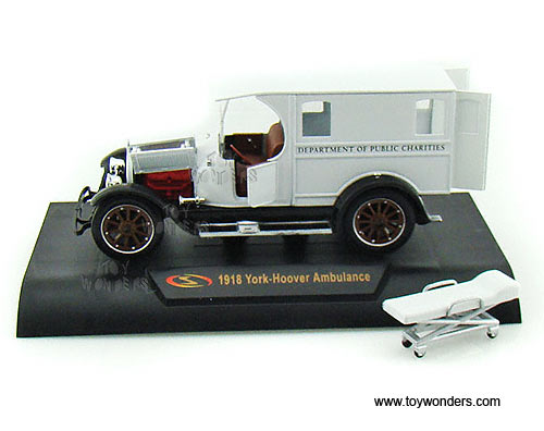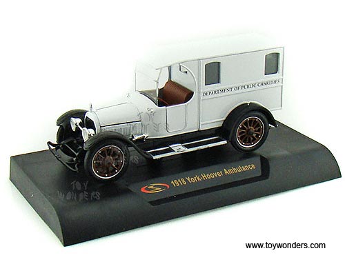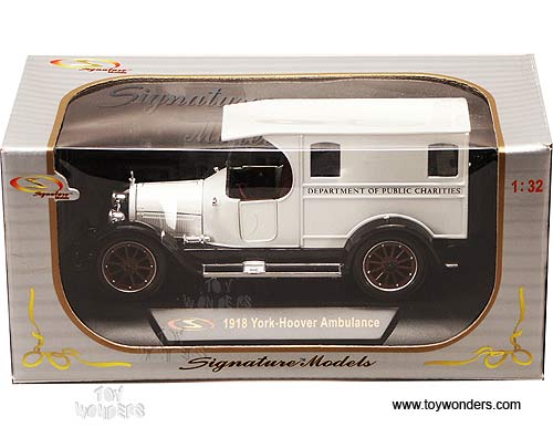 32428 Signature Models - 1918 York-Hoover Ambulance Department of Public Charities. 1:32 scale diecast model car. This York-Hoover Ambulance is a 5.75"L x 2"W x 2.5"H die cast metal with openable doors & hood. Sits on a display plaque. This York-Hoover Ambulance is manufactured by Signature Models. 32428 is in WHITE color. Individually packed in a window box. Box size: 8"L x 4"W x 3.75"H.