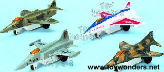4.25"L die cast metal fighter jets with metal pull-back motor action. 2.5" wing span.