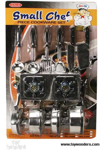 3364 Small Chef Piece Cookware Play Set. 15 pcs kitchen play set includes stoves, pans, knives, and more. Card size: 11.25" x 17.25". 12 pcs per inner box.