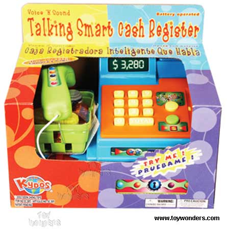 SC389 Smart Cash Register. 8" talking cash register that talks, beeps, rings, & drawer opens. includes scanner, coins & a credit card. in a TRY ME box. includes 2"AA" batteries. Box size: 10.5"Lx 8.25"Wx 6"H.