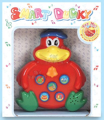 SC637 Smart Ducky. 6.5" tall red duck w/ buttons on tummy that play sound effects and melodies. Includes 2 "AA" batteries. Box size: 7.5"Lx2.75"Wx8.75"H.