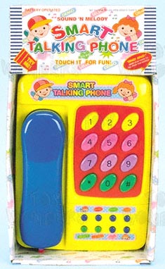 SC353T Smart Talking Phone. 6.75" phone w/sound & melody. Dial tone, 36 harmony melodies in piano & messages. In a TRY ME box. Includes 2 "AA" batteries. Box size: 6.75"Lx 3"Wx 12"H.