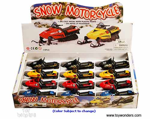 9918D Snowmobile. This snowmobile is a 5.5" pullback diecast metal with plastic parts. 12 pcs per display box and in assorted colors. 72 pcs per inner box.