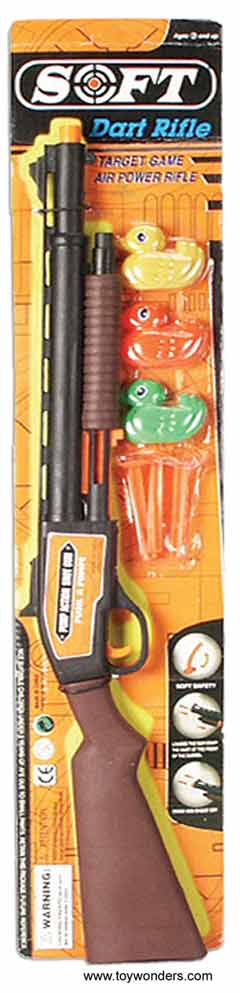 5489 Soft Dart Rifle. 19.5" pump action shot gun with 3 ducks and 3 soft darts. Blister card size: 4.75"x22.5". 24 pcs/inner.