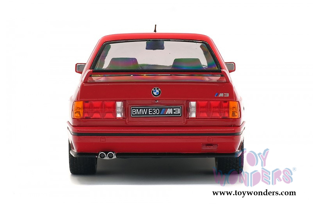 S1801502 Solido - 1990 BMW E30 M3 Hardtop. 1:18 scale diecast collectible model car. This BMW is a 9"Lx 3.25"Wx 3"H diecast metal car with directional wheels and openable doors. Model comes attached to a stand. Each individually packed in a window box. Window Box size is 12.25"Lx 6"Wx 5.5"H. S1801502 is in red. This BMW is manufactured by Solido.