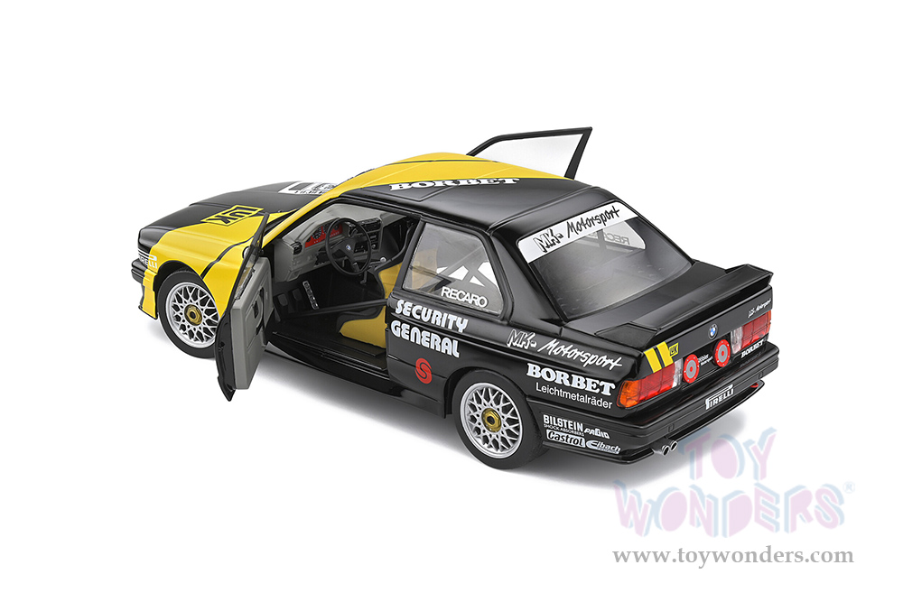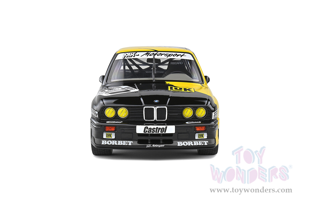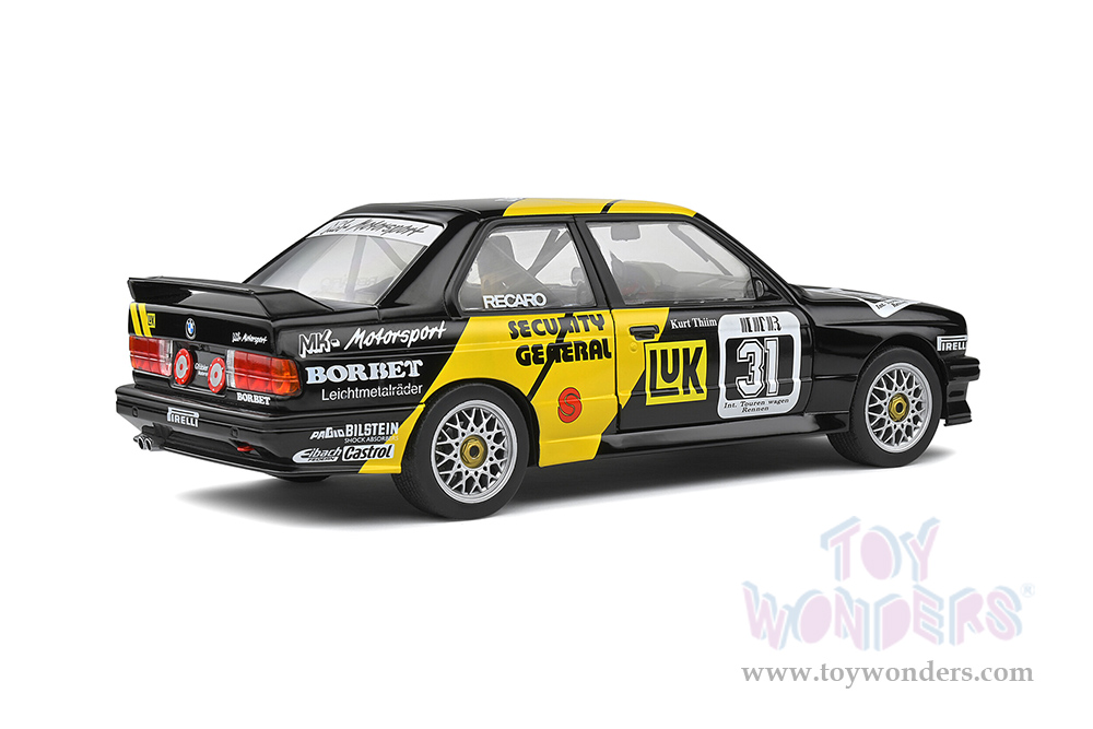 S1801508 Solido - 1988 BMW E30 M3 #31 Kurt Thiim "LuK" DTM Deutsche Tourenwagen Masters. 1:18 scale diecast collectible model car. This BMW is a 9.5"L x 3.75"W x 3"H diecast metal car with directional wheels and openable doors. Model comes attached to a stand. Each individually packed in a window box. Window Box size is 12.25"L x 6"W x 5.5"H. S1801508 is in Black with Yellow. This BMW is manufactured by Solido.