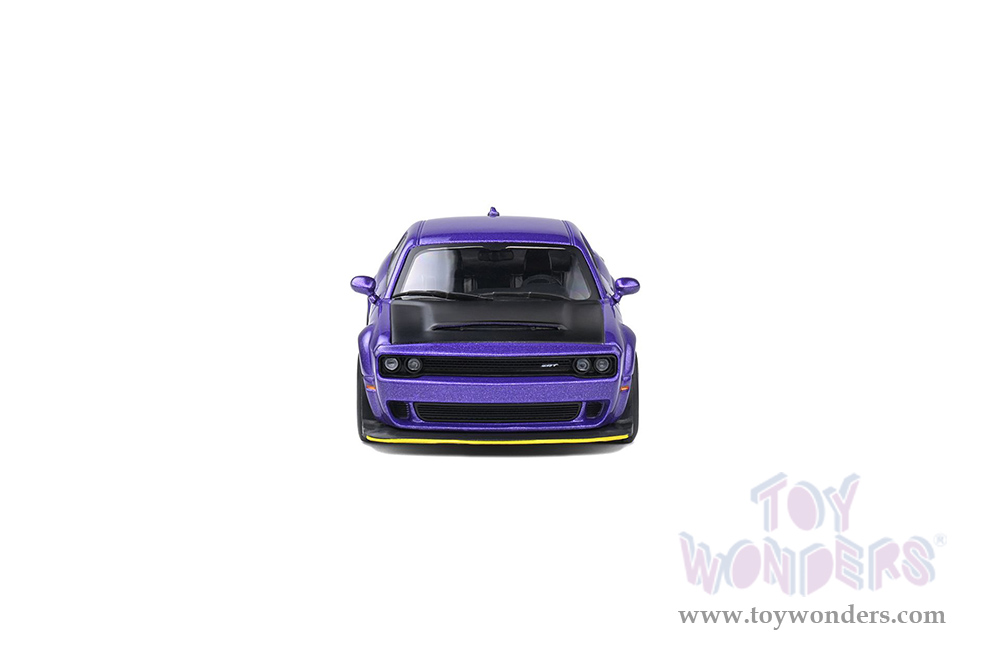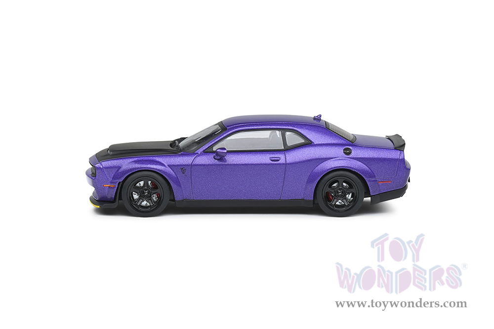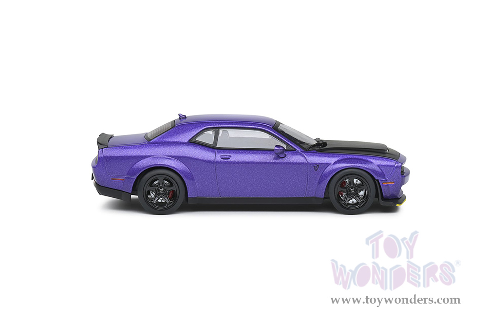 S4310302 Solido - 2018 Dodge Challenger SRT Demon V8 6.2L. 1:18 scale diecast collectible model car. This Dodge is a 4.25"L x 1.75"W x 1.25"H diecast metal car. Model comes attached to a stand. Each individually packed in a window box. Window Box size is 6"L x 3.25"W x 2.5"H. S4310302 is in Plum Crazy. This Dodge is manufactured by Solido. Car is not openable.