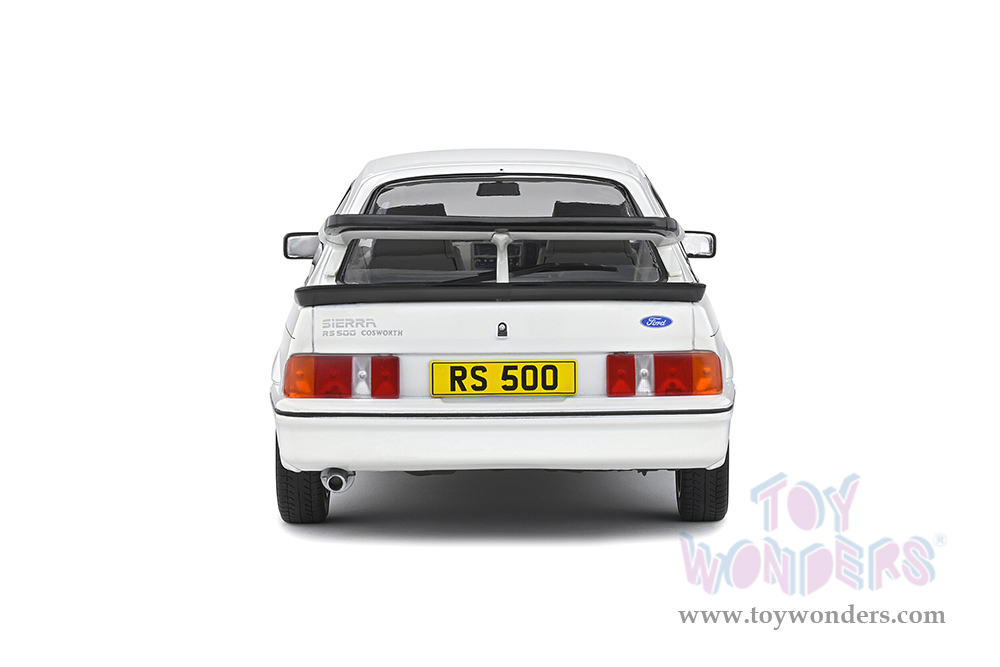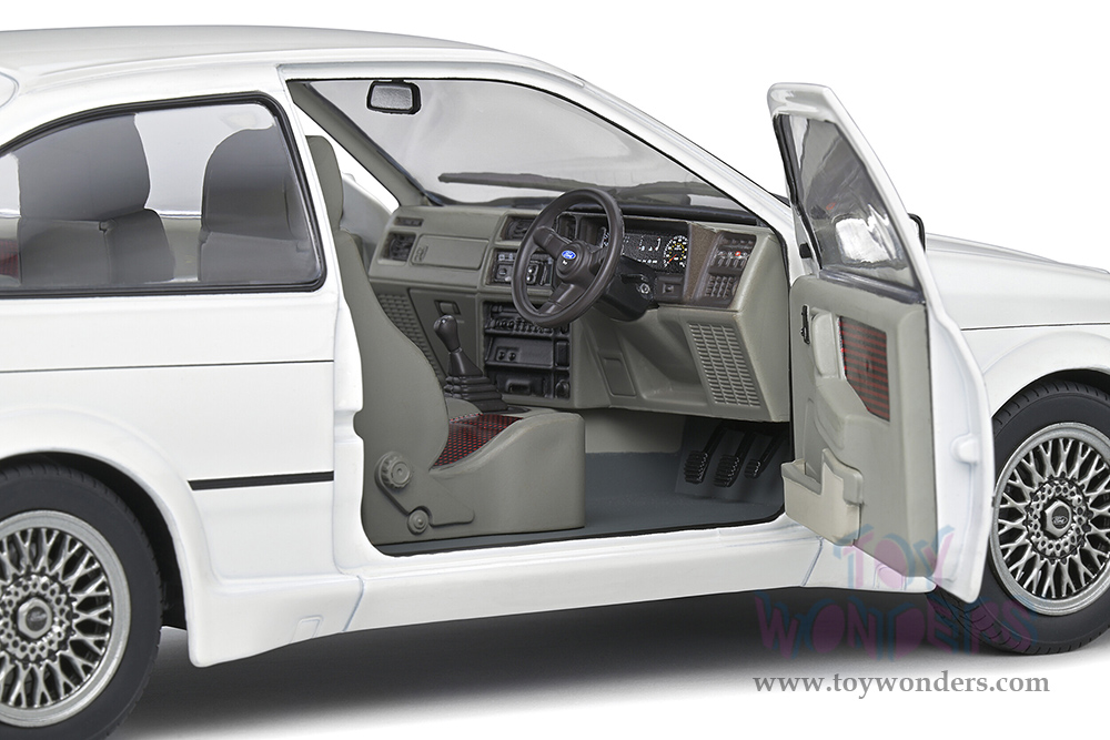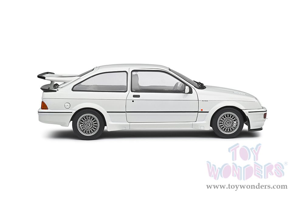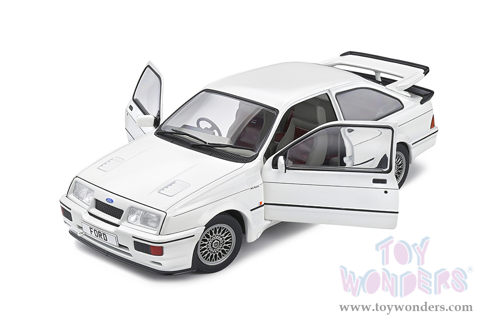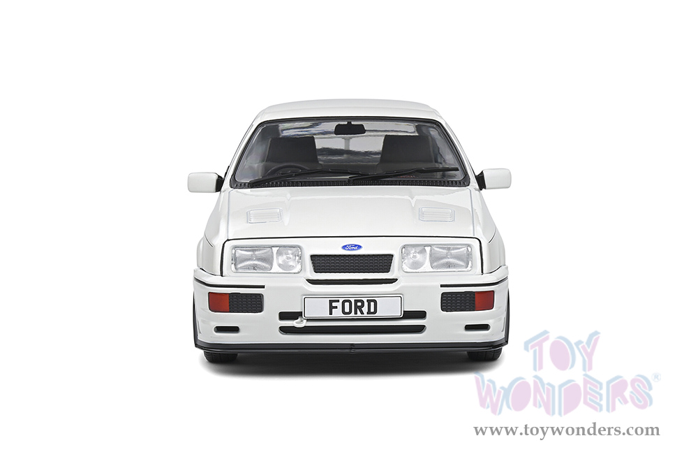 S1806104 Solido - 1987 Ford Sierra Cosworth RS500. 1:18 scale diecast collectible model car. This Ford Sierra is a 9.5"Lx 4"Wx 3"H diecast metal car with directional wheels and openable doors.  Model comes attached to a stand. Each individually packed in a window box. Window Box size is 12.25"Lx 6"Wx 5.5"H. S1806104 is in White. This Ford Sierra car is manufactured by Solido.
