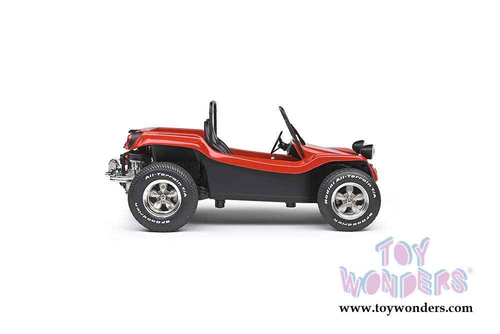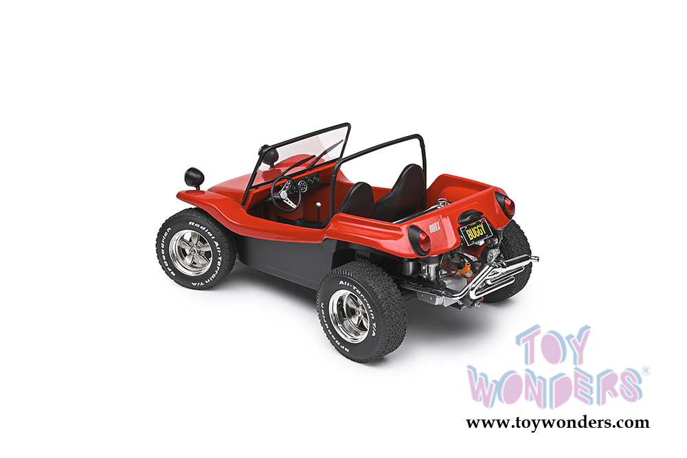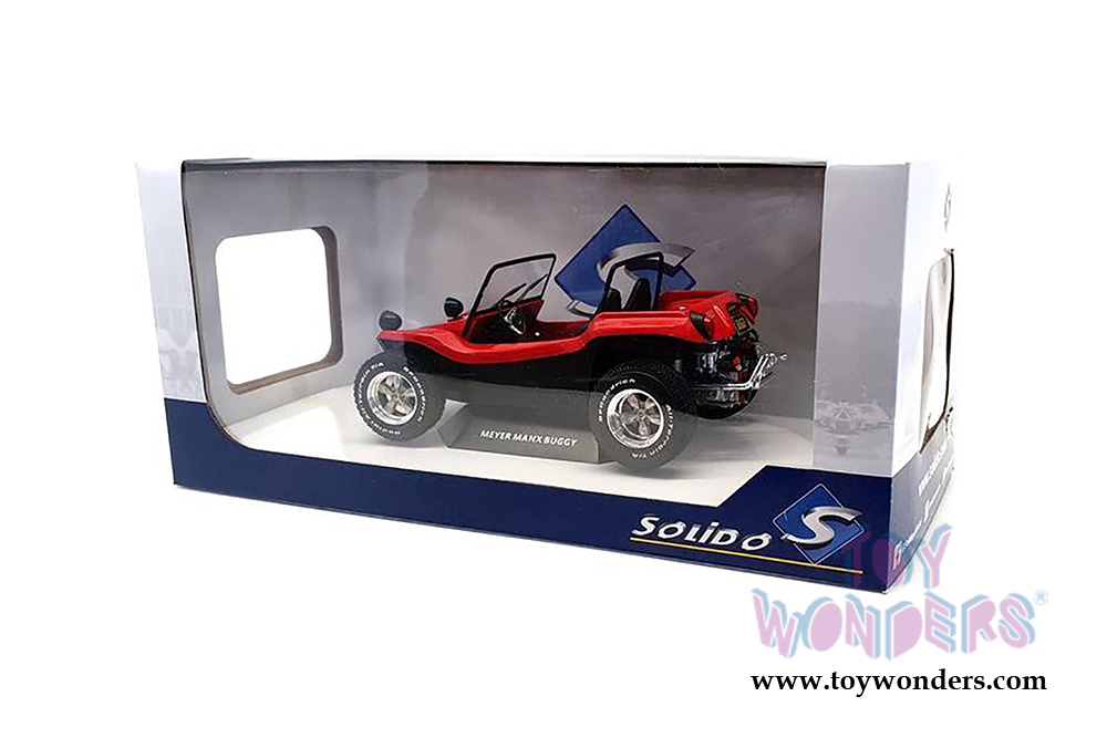S1802704 Solido - 1968 Meyer Manx Dune Buggy. 1:18 scale diecast collectible model car. This Buggy is a 6.75"L x 4"W x 3"H diecast metal car with directional wheels. Model comes attached to a stand. Each individually packed in a window box. Window Box size is 12.25"L x 6"W x 5.5"H. S1802704 is in RED color. This Meyers Manx Buggy is manufactured by Solido. Car is not openable.