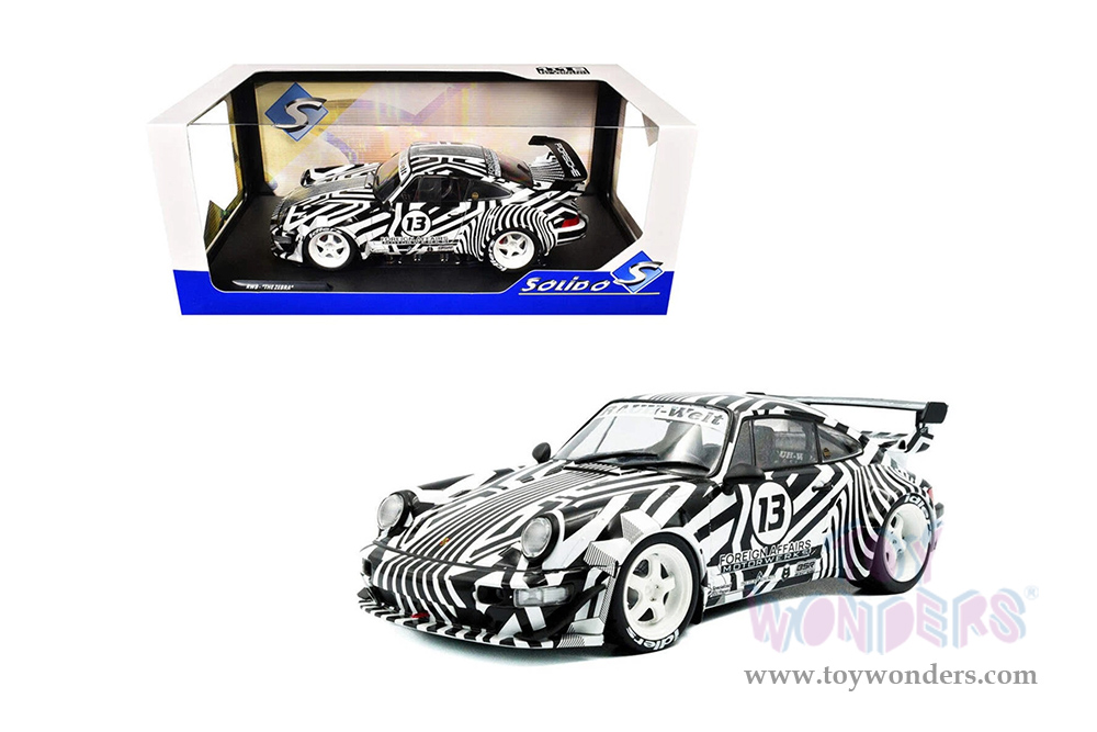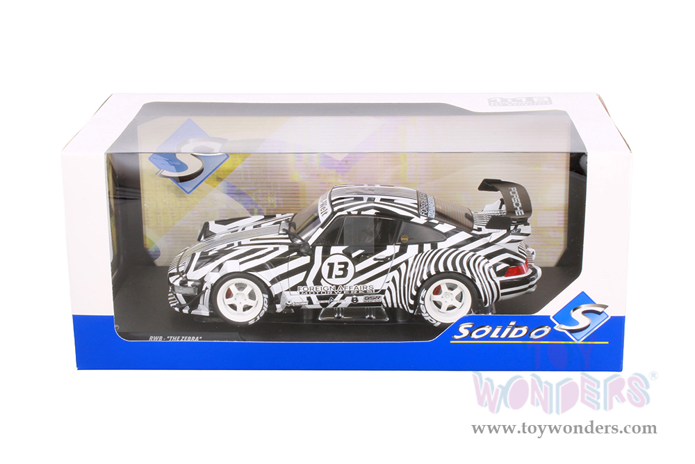 S1807513 Solido - 2022 RWB Bodykit #13 "The Zebra". 1:18 scale diecast collectible model car. This RWB is a 9"L x 4"W x 2.75"H diecast metal car with directional wheels, opening doors. Model comes attached to a stand. Each individually packed in a window box. Window Box size is 13"L x 6.5"W x 5.25"H. S1807513 is in black and white stripes. This RWB is manufactured by Solido.