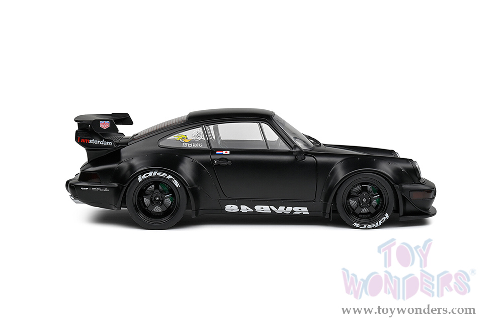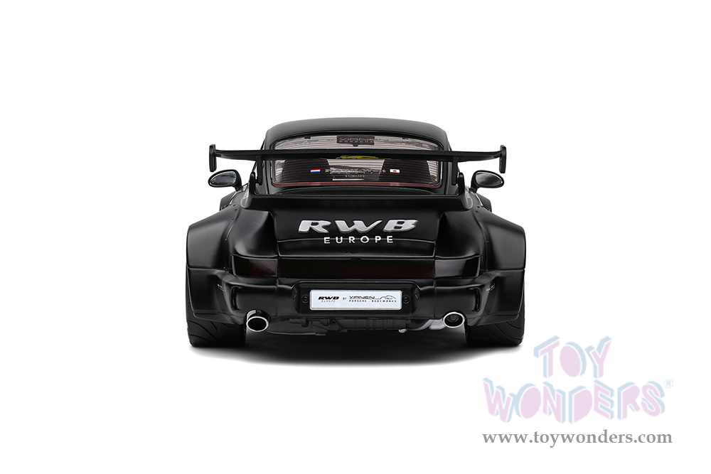 S1807508 Solido - 2016 RWB Bodykit Darth Vader. 1:18 scale diecast collectible model car. This RWB is a 9"L x 4"W x 2.75"H diecast metal car with directional wheels, opening doors. Model comes attached to a stand. Each individually packed in a window box. Window Box size is 12.75"L x 6.5"W x 5.25"H. S1807508 is in matte black. This RWB is manufactured by Solido.