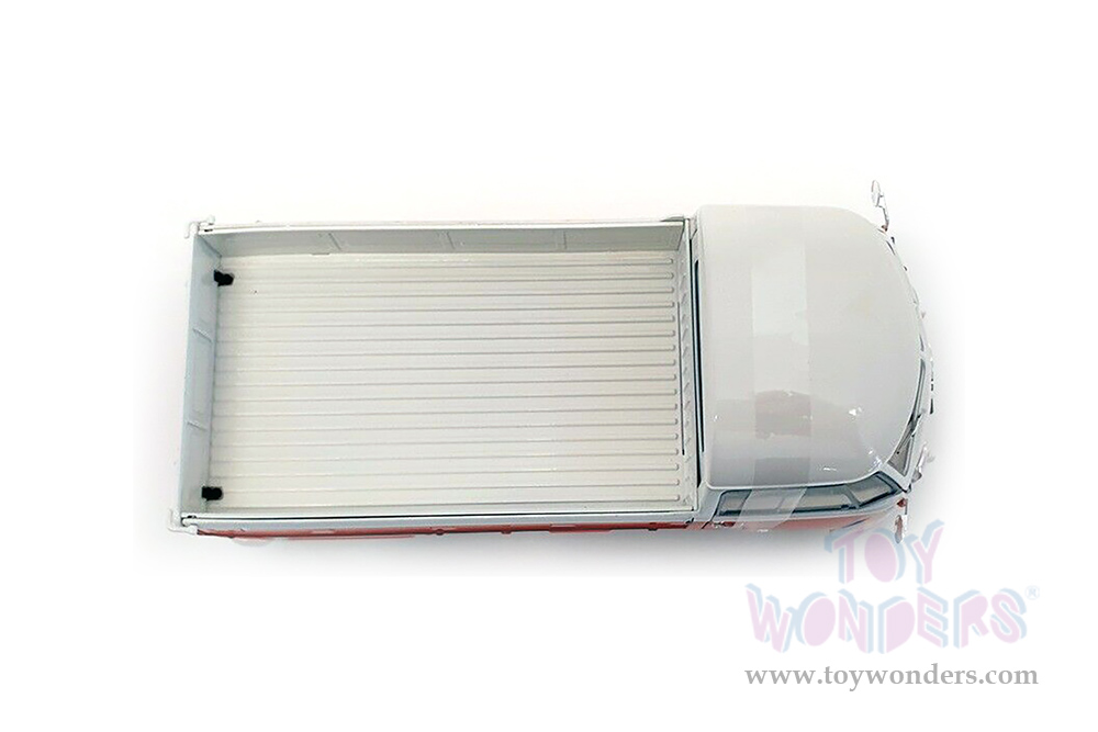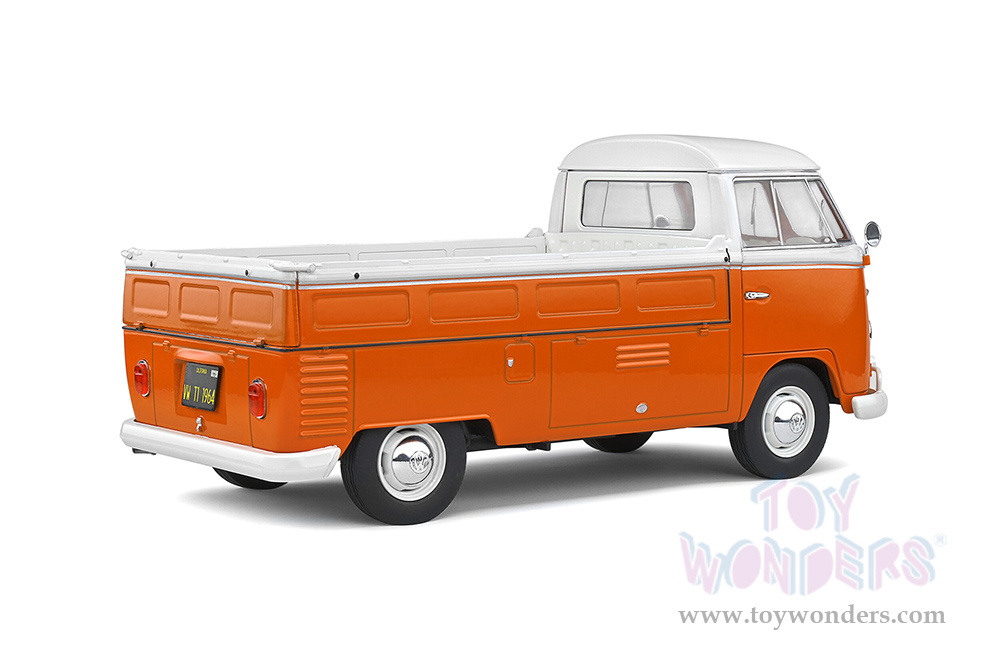 S1806701 Solido - 1950 Volkswagen T1 Pick Up with Surfboard. 1:18 scale diecast collectible model car. This Volkswagen is a 9.5"L x 3.5"W x 4"H diecast metal car with directional wheels and openable doors. Model comes attached to a stand. Each individually packed in a window box. Window Box size is 12.25"L x 6"W x 5.5"H. S1806701 is in Orange and white. This VW is manufactured by Solido.