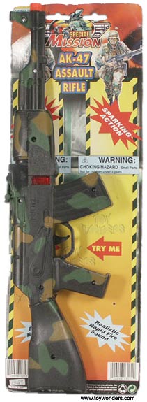 13487 AK 47 assault rifle with realistic rapid fire sound. Sparking light on side of gun when pulling the trigger. Card size: 6.75" x 19.5". Inner: 12 pcs.