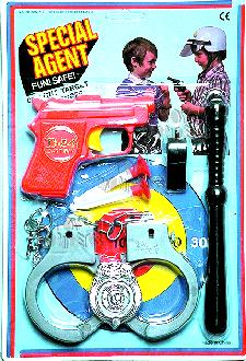 215/7 Special Agent set for young officers. Includes a dart gun with two darts, handcuffs, whistle, badge and a Billy club. Blister card size: 8" x 12". 12 sets/inner. Dollar item.