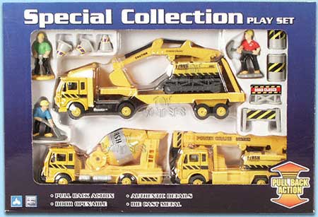 607/3 Special Collection (assorted styles). These 5.5" diecast pullback action fire rescue, police and construction vehicle set comes in 3 asstd. vehicles plus figures and signs to help route traffic. Box size: 14"Lx2.25"Wx9.5"H. 12 pcs per inner box.