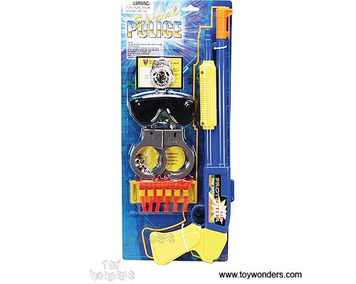 9008/6 Special Police Play Set. This playset includes an 18.5" long gun, soft bullets, police badge, handcuffs and sunglasses. Card size: 8" x 19.5". 24 pcs/inner.