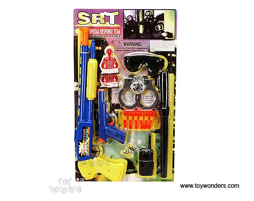 9008/36 Special Response Team (SRT). 18.5" pump action soft dart shotgun, handgun, sunglasses, handcuffs, cell phone and much more. Card size: 21.75"x12.25". 12 sets/inner.