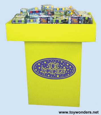 TABLE1 - Speed Table. Corrugated cardboard speed table measures 25.75"W x 22.75"W x 29.5" High when assembled. Table is 5" deep. Footprint is 15" x 18". Easy folding assembly. Printed with a Toy Wonders logo on the side. Shipped flat. This speed table does not come with any products. Comes with $5 credit towards the purchase of other Toy Wonders products.