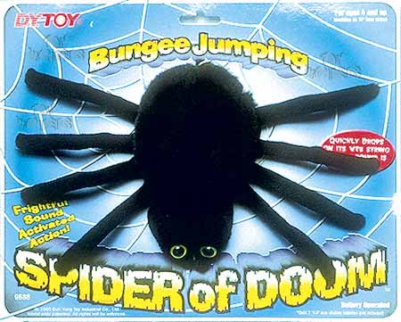 9688 It's the Spider of Doom! 9.5" sound activated jumping spider on a bungee string that can attack and hang from the ceiling. Requires two "AA" batteries. Blister card size: 11"x15". 12 pcs/inner.