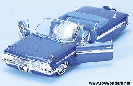 50301/2 Chevy Impala (1961) Convertible. This 1961 Chevrolet Impala is an 8.75" long diecast metal with free wheel, low rider, and opening doors/hood. Also has hanging dice from mirror. Street Low streetlow Low-Rider Collection. This 61 Chevy Impala is manufactured by Jada Toys. Cars measure 8.75"L x 3"W x 2"H. 4 pcs per display box and in assorted colors. 20 pcs per inner box.