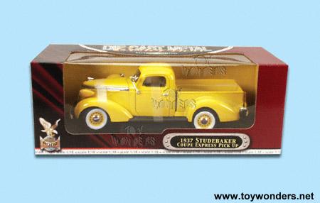 92458YL/1 YATMING ROAD SIGNATURE Studebaker Pick Up (1937) 1:18 scale diecast model. This Classic oldies car is 11"L x 4"W x 3.25"H diecast metal pickup truck with opening doors, free wheels, and workable steering. This 1937 pick-up truck has highly detailed engine and components. This 37 pick up truck is manufactured by Yat Ming. Box is 14"W x 5.25"H x 6"D. 6 pcs per inner box. YELLOW only.